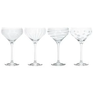 Party in style with this set of four champagne saucers from tabletop industry leader Mikasa. Be unique with precision-etched designs in a sophisticated, coordinating collection. Made of stunning crystal glass, each champagne glass is decorated with it`s own distinct, celebration-ready design. Guests will be delighted when you serve them bubbly or sparkling wine in their own glass, etched with shimmering silver sweeps, loops or dots. You Don`t have to save them for parties, though. Bring them out when you`re celebrating good news – whether with friends or a loved one. This set comes in a beautiful gift box, making it a wonderful gift for anyone who loves to entertain, or who simply appreciates elegant glassware.