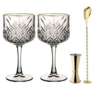 Treat your favourite gin lover with this sophisticated Gin Glasses Essentials Set. The Timeless Vintage Gold Set features a stunning vintage inspired cut glass design with a gold rim for added flair. Made from soda lime glass for durability, these Vintage Glasses are also incredibly versatile and can be used to serve a whole host of cocktails and even wine.
