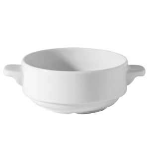 Their space saving stackable design features lugged handles that provides convenient transporting for serving hot soup at the table. Possessing a traditional white glazed finish, these soup dishes are durable and versatile enough to serve a wide variety of side dishes such as mussels and fries.